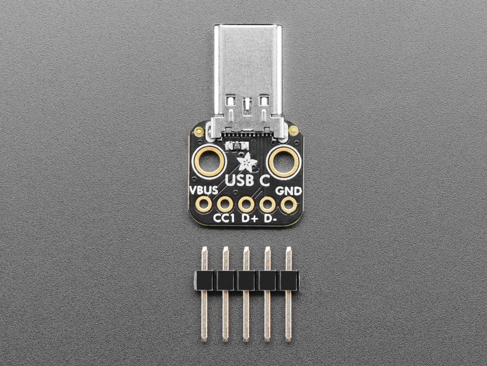 USB C features a symmetric/reversible connector, more data pins and higher current output capability. But, for most developers, the pin usage you know and love from older USB will work just fine. This breakout gives you all the basics you need and a resistor configuration that will make sure you get 5V power. We chose a plug that has a semi-through hole mounting configuration that seems fairly mechanically stable. That said, it will not survive purposeful bending the way a Type A would.