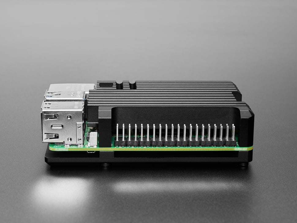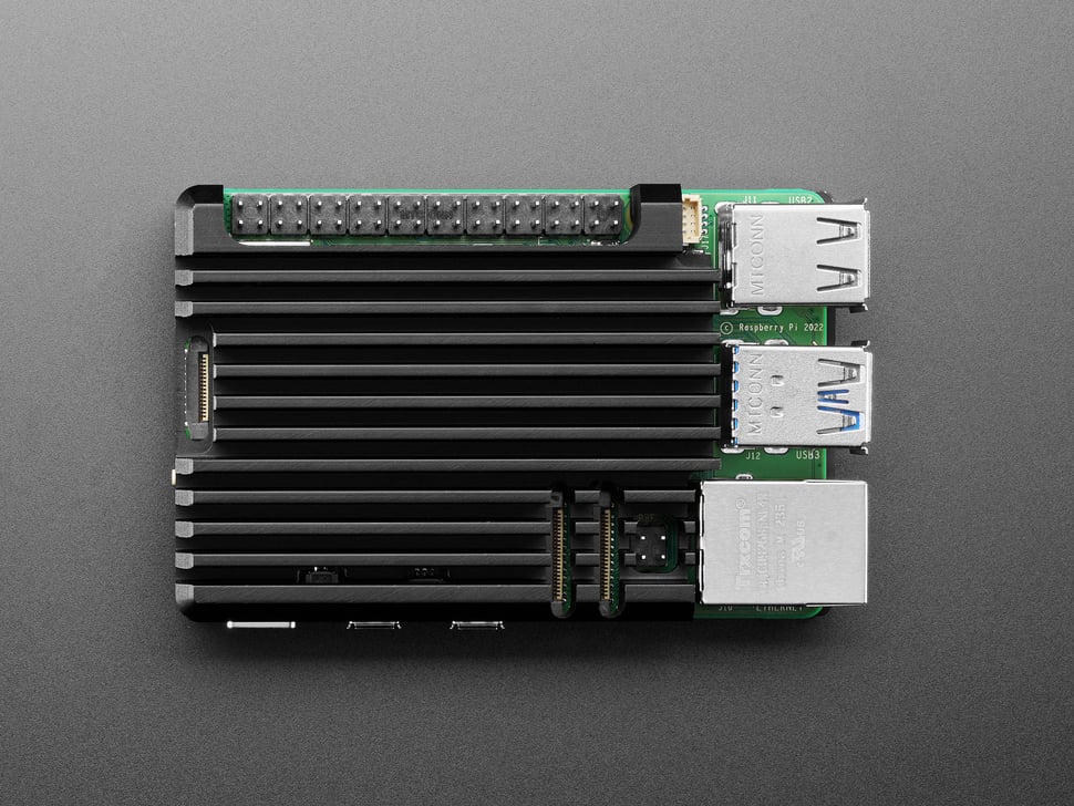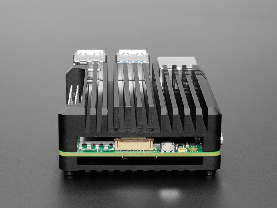 Constructed from solid anodized aluminum, so it's got nice heft. It has slim openings for all your cables, slots for your Pi Camera and other peripherals, and a space for a GPIO cable to extend out from the Pi. The body acts as a heatsink for the main chip.