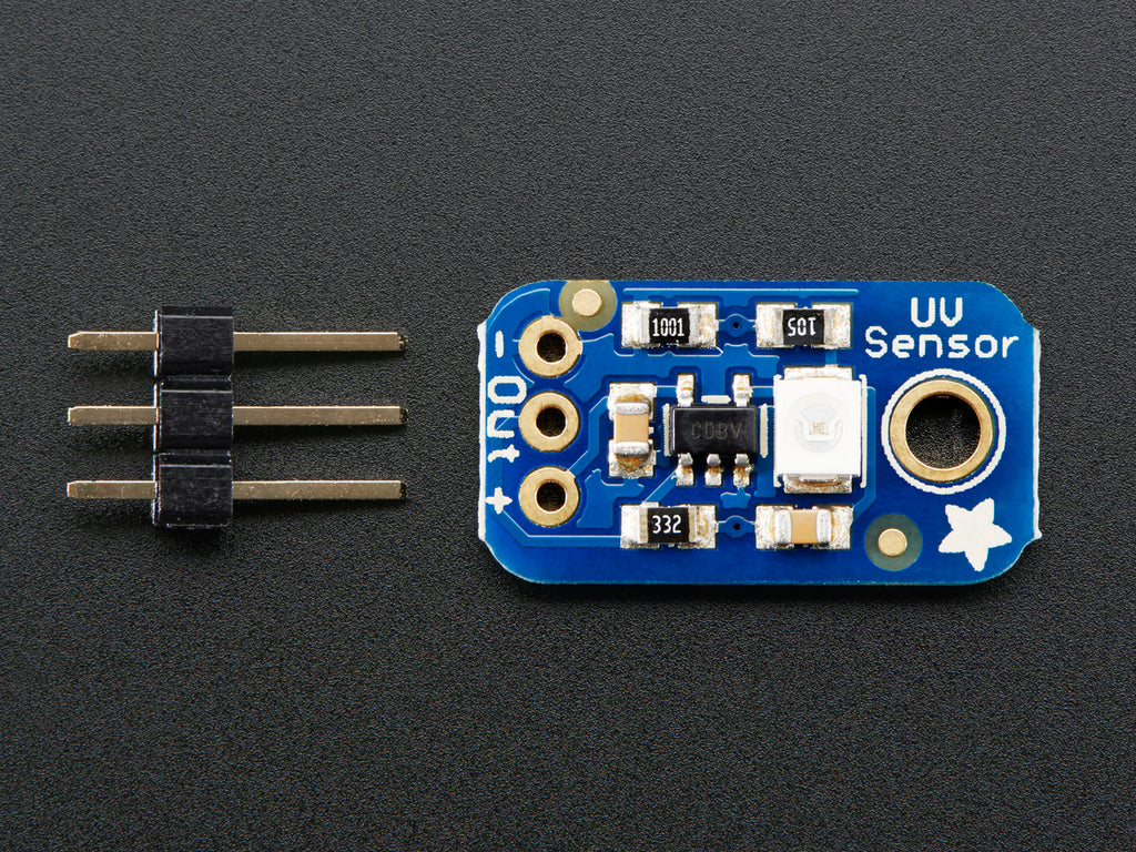 This sensor is much simpler than our Si1145 breakout, it only does one thing and gives an analog voltage output instead of requiring a complicated I2C setup procedure. This makes it better for simple projects. It also has a 'true' UV sensor instead of a calibrated light-sensor. To use, power the sensor and op-amp by connecting V+ to 2.7-5.5VDC and GND to power ground. Then read the analog signal from the OUT pin. The output voltage is: Vo = 4.3 * Diode-Current-in-uA. So if the photocurrent is 1uA (9 mW/cm^2), the output voltage is 4.3V. You can also convert the voltage to UV Index by dividing the output voltage by 0.1V. So if the output voltage is 0.5V, the UV Index is about 5.