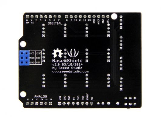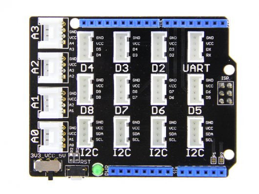 - Power Compatible: Every Grove connector has four wires, one of which is Vcc. However, not every micro-controller main board needs a supply voltage of 5V, some need 3.3V. That's why we add a power switch to Base Shield v2. In this way, you can adjust the voltage of Vcc via this switch, making sure the voltage of Vcc is the same as supply power of the main board.