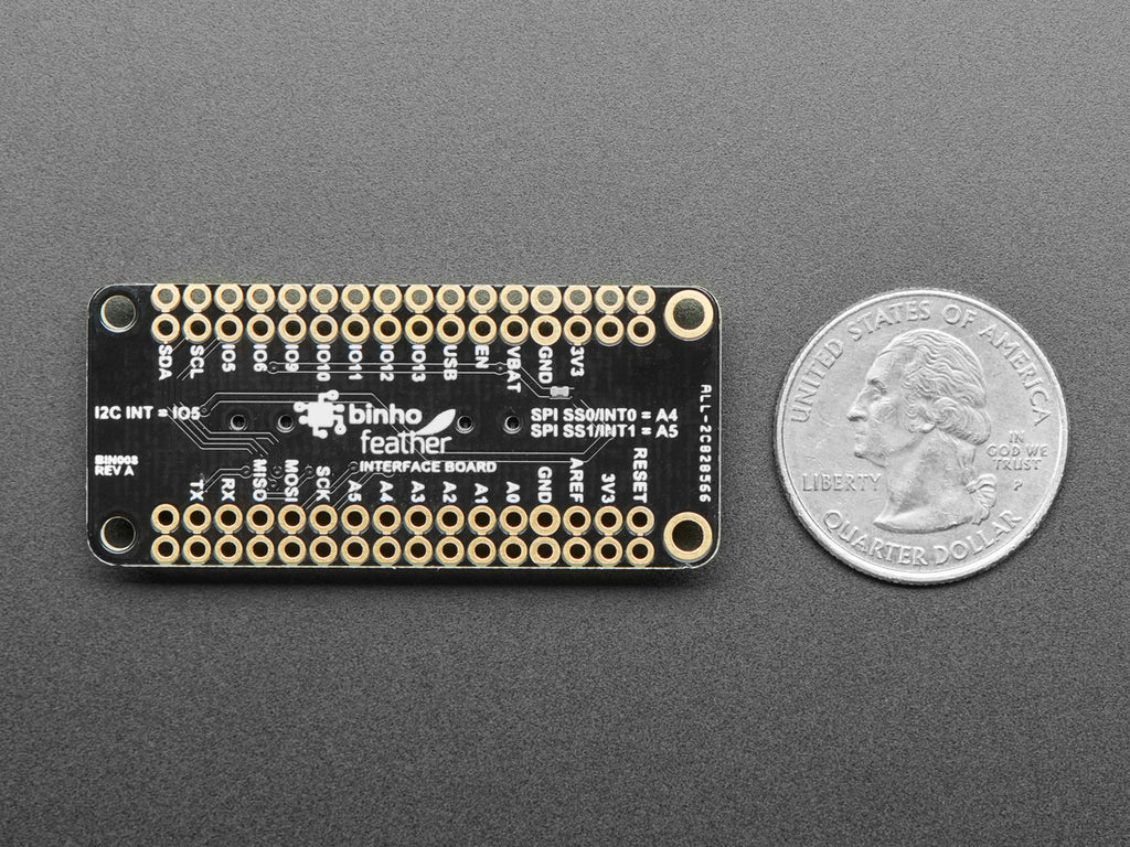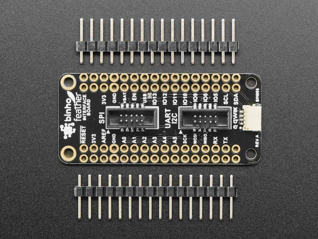 This board makes it easy for you to interface your Binho Nova host adapter with any Feather form-factor device. I2C, SPI, and UART interfaces are all wired up. By default, the 3V3 and 5V rails are connected so that the Binho Nova can power the sensors, but this can be easily disabled by cutting the exposed traces. Additionally, this interface board features a STEMMA QT / Qwiic connector to easily bridge the Feather and Qwiic ecosystems.
