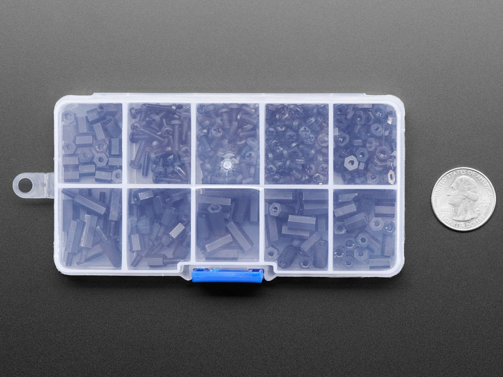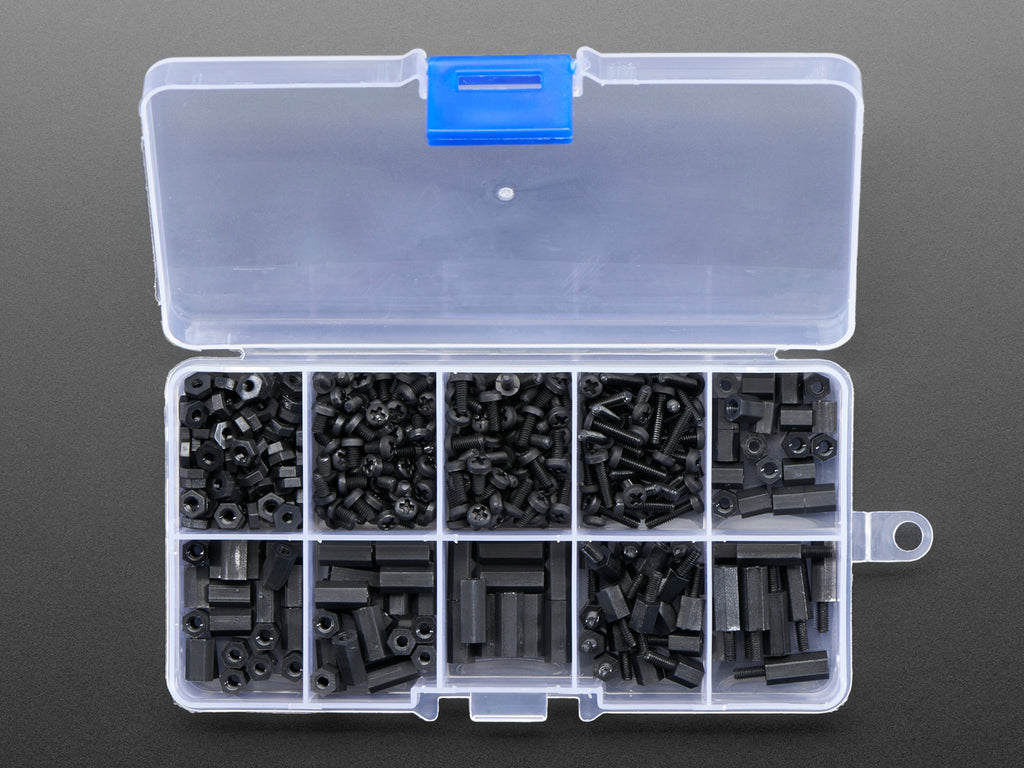 Totaling 380 pieces, this M2.5 Screw Set is a must-have for your workstation. You'll have enough screws, nuts, and hex standoffs to fuel your maker tendencies for days on end! M2.5 size screws fit almost all of the Adafruit breakout/dev board mounting holes (2.5mm or 0.1" drill holes). Works great with Feathers, Adafruit breakout boards, Pi HATs and plates, and more! Since they are nylon you can file them down easily, and they don't conduct electricity or interfere with antennas/magetometers.