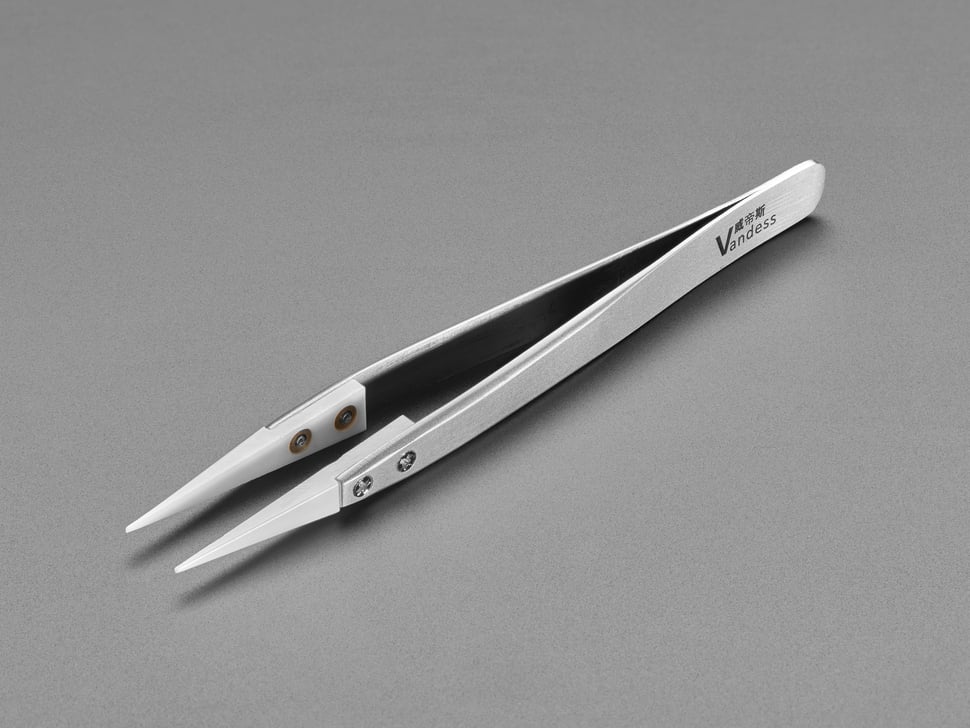 You'll need a good pair of tweezers when soldering delicate surface-mount (SMD/SMT) components. These are a great pair of precision, heat-resistant tweezers. They've got a metal body and ceramic inset tips, so they are anti-magnetic and will not bend with use. The tips are fine and pointy to pick up components without risk of scratching, and because they are ceramic, they are also excellent for holding parts during hot air rework or if you're going to get close with your soldering iron.