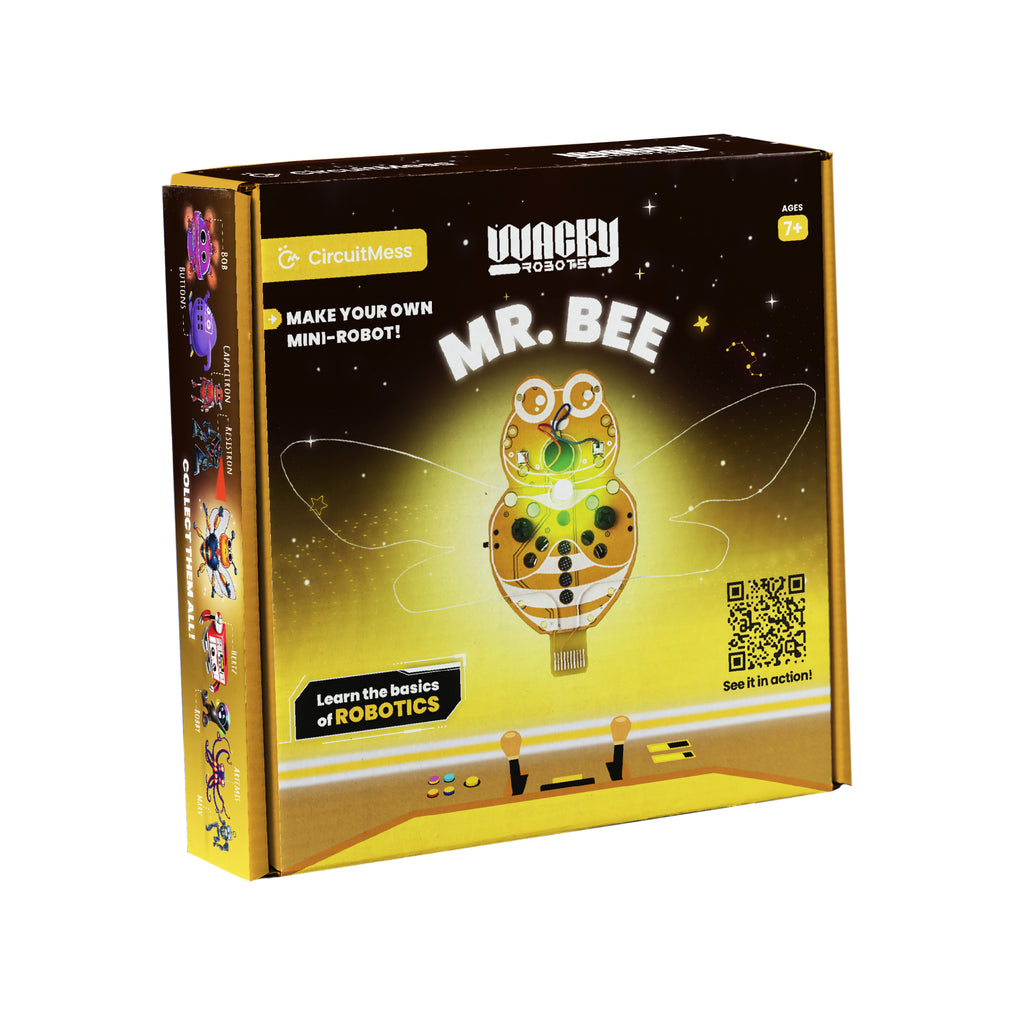 Meet Mr. Bee, a DIY Wacky Robot that will introduce you to the exciting world of robotics and STEM. With Mr. Bee, you’ll learn about different electronic components, vibration motors, and resistance.