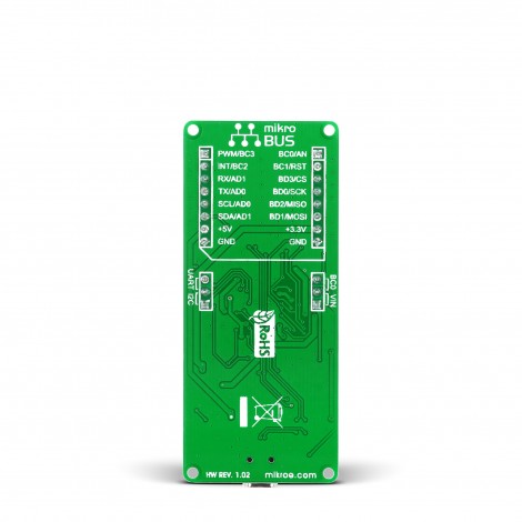 click USB adapter board can be powered through a USB cable only. Onboard power circuitry generates 3.3V and 5V, necessary for different Click board™ types.