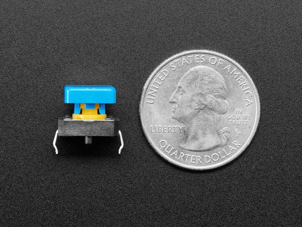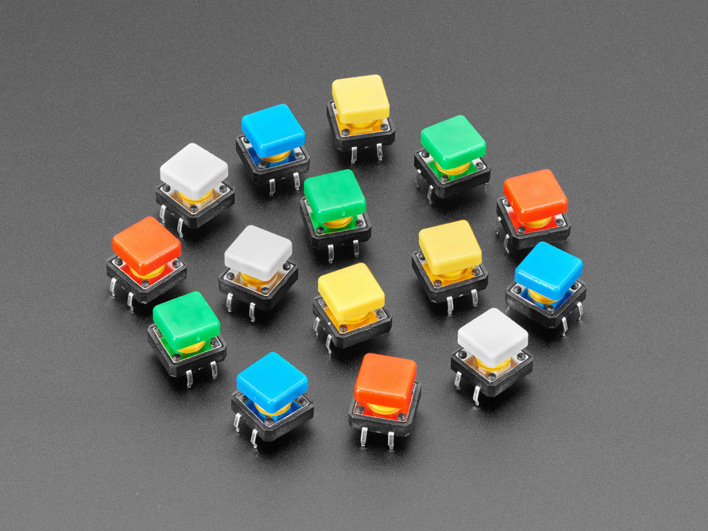These buttons are bigger than the 6mm ones we carry, and come in a pack of 15. Each button comes with a candy-colored square cap that snaps on. You get three of each color-- blue, grey, yellow, green, and red. The square plastic button tops affix easily to the tactile switch body.