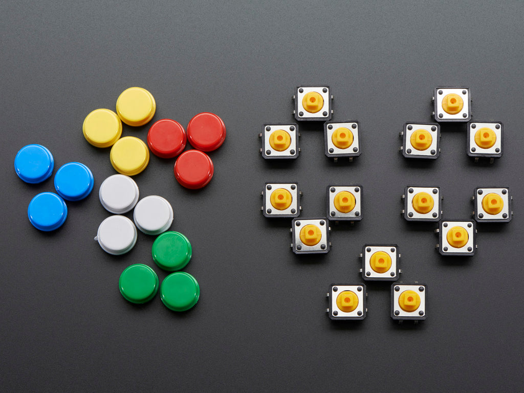 These buttons are bigger than the 6mm ones we carry, and come in a pack of 15. Each button comes with a candy-colored round cap that snaps on. You get three of each color-- blue, grey, yellow, green, and red. The round plastic button tops affix easily to the tactile switch body.