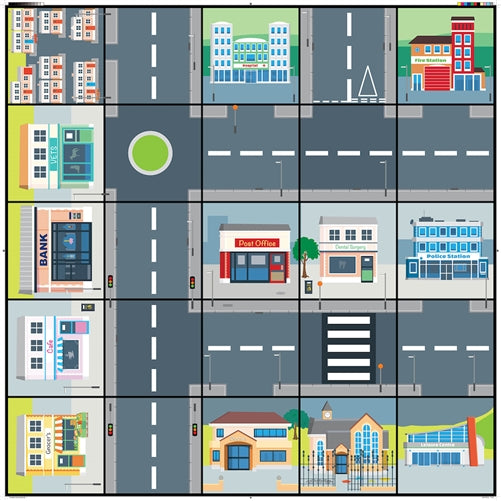 This mat connects to 3 other mats to create the Bee-Bot World. The Bee-Bot World contains the Countryside mat, Seaside mat, People Who Help Us mat and the Transport and Industry mat. (Sold separately.)