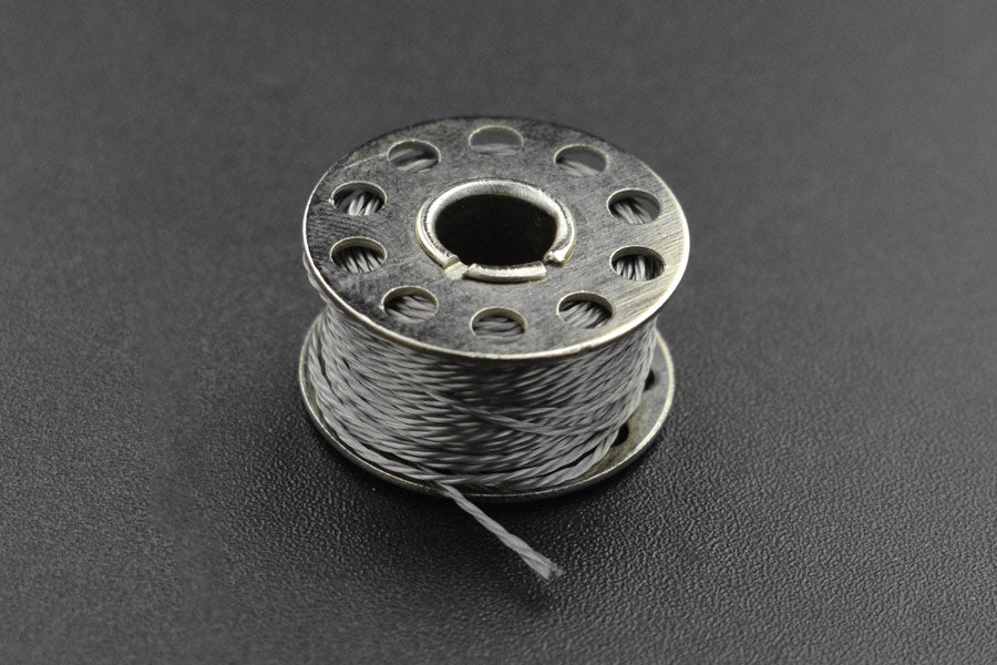 This is a smooth stainless steel fiber conductive sewing thread. It features small resistance, good thermal conductivity, high melting point and high-temperature resistance. One roll has 7m sewing thread, and about 9Ωper 1m. The diameter of the wire is 0.45mm. It can be used for making touchscreen gloves, anti-static clothing, wearable electronic equipment, anti-static brush, driving LED and other small current electronic components.