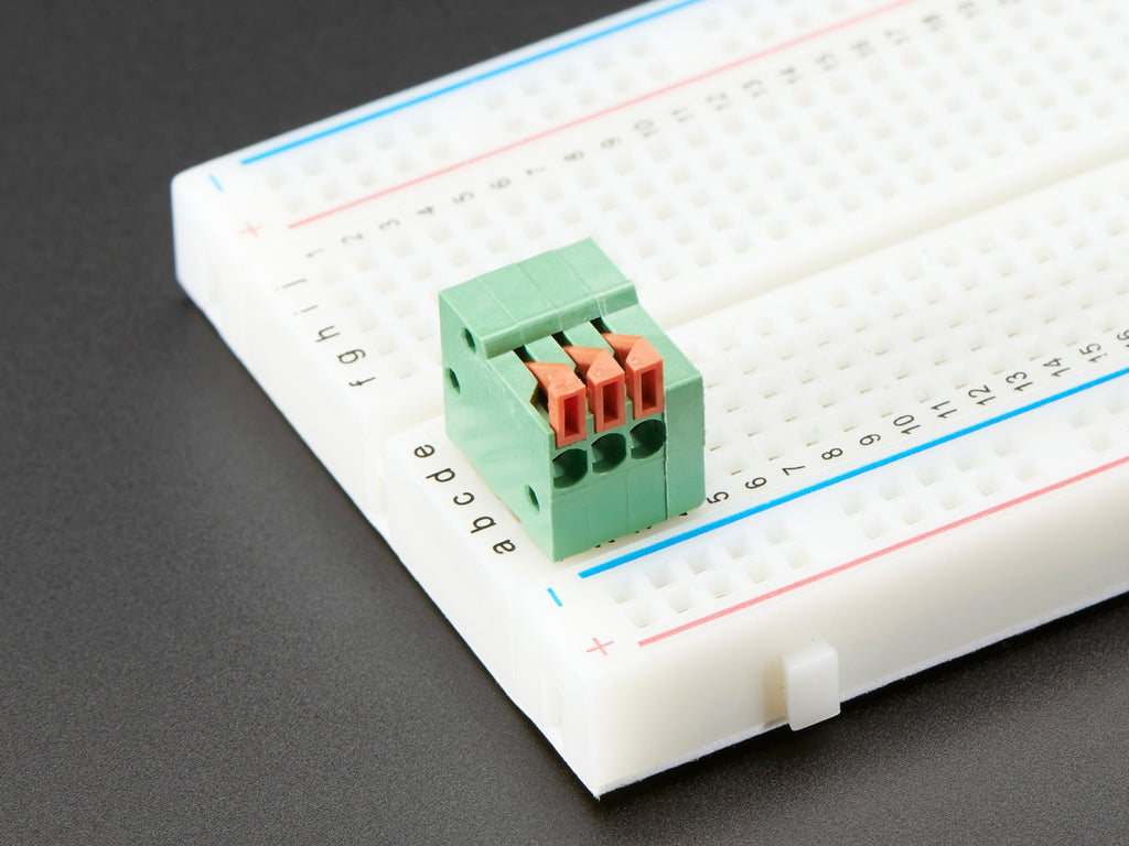 Spring terminal blocks will simplify your wiring and make your project more rugged. Instead of soldering wires to your perf board, solder in these 0.1" pitch terminal blocks. There's a little spring contact so you can pull back on the plastic bit and slip in your 20 to 26 AWG solid or stranded-core wires. Each terminal block is electrically isolated from those next to it. Each block also has two solder pins per contact for strong mechanical strength when soldering in place.