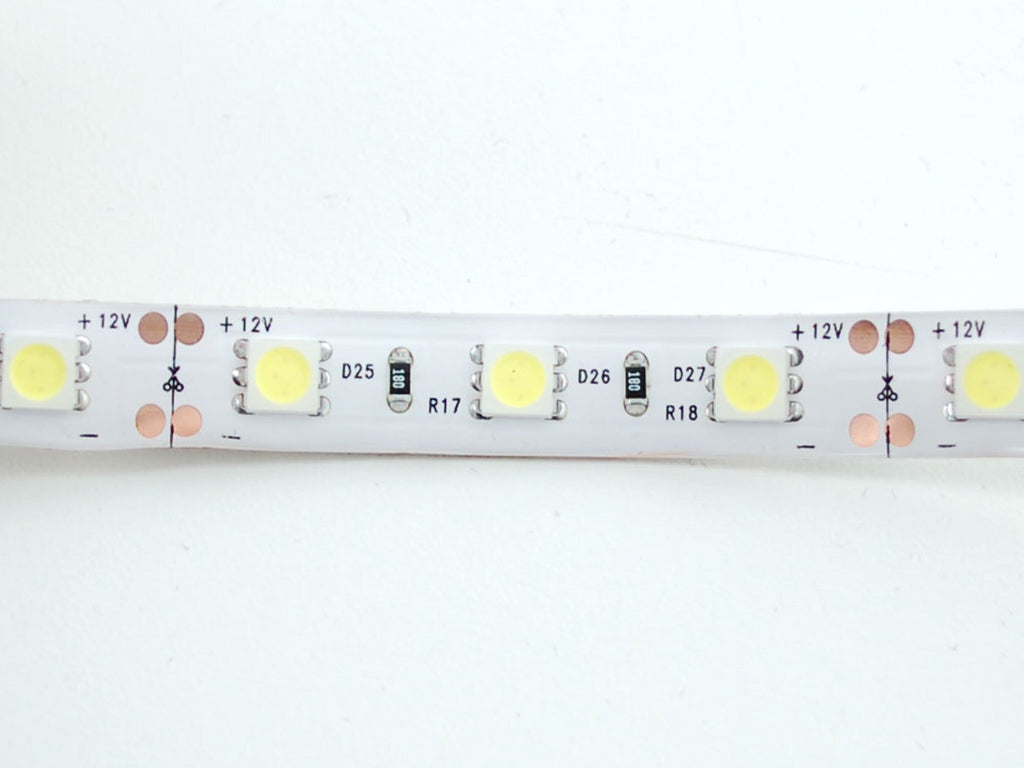 We splurged and got the weatherproof kind with white background color. There's a 3M adhesive strip on the back which should stick to most smooth surfaces. Great for architectural lighting (under-counter or under-cabinet), decorating your bicycle or car, making lamps, etc. You'll need a lot of power to light these up, we suggest our 12V 5A supply. To connect it to a power supply, pick up a 2.1mm female jack and wire it to the strip with some heat shrink. For portable use, we suggest a 8xAA battery holder
