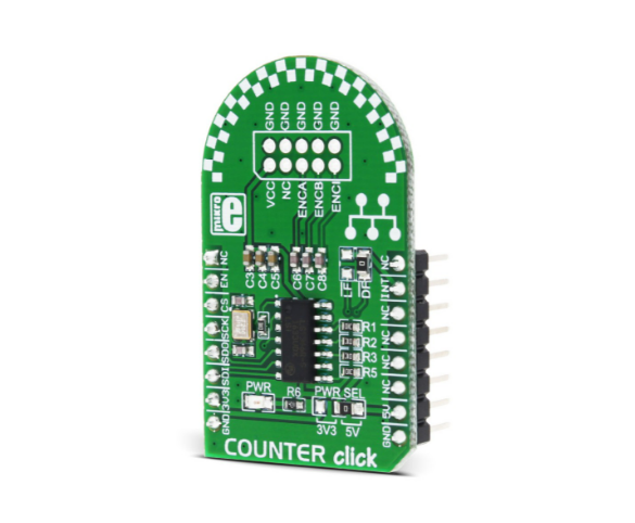 Counter Click is a compact add-on board that allows you to add a quadrature counter to your design. This board features the LS7366R, a 32-bit quadrature counter with a serial interface from LSI Computer Systems. The LS7366R reads the incremental encoder A and B pulses over unpopulated ten pins header, which are out of phase to each other, ideally by 90°. By decoding them, the LS7366R can determine the direction and speed of the shaft. This Click board™ makes the perfect solution for measuring RPM and speed of DC motor shafts, reading incremental encoders, and more.