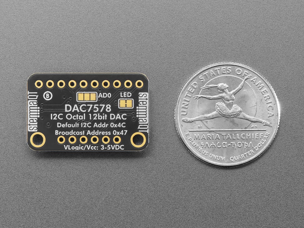 If you've ever said to yourself, "Gee, I wish I had eight 12-bit DACs that came in a single package", well I have good news. The Adafruit DAC7578 Breakout is the answer to your wishes! Within its little package, the DAC7578 has eight 12-bit DACs for whatever voltage setting needs you may have, easily controlled over I2C.