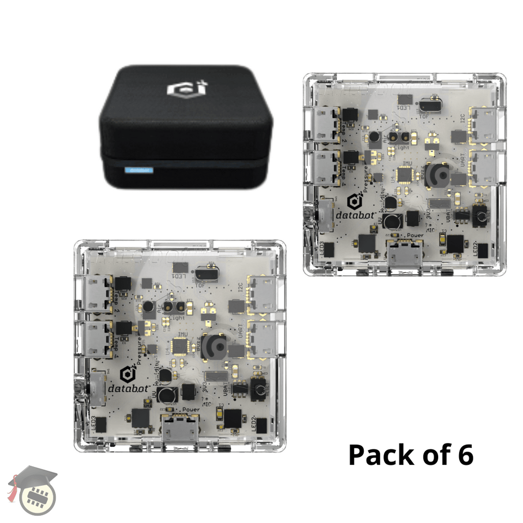 This tiny package packs a wallop with more power and capabilities than any other multi-sensor device on the planet.  Ideal for multi-disciplinary investigations, students need only one databot™, a smart device, and insatiable curiosity to explore the invisible world of scientific data that surrounds us! Unlimited experiments with these tools at your fingertips:  UV, Sound, Acceleration, CO2, Gyroscope, Air Pressure, External Temperature probe, Altitude, Magnetism, Humidity, Ambient Light, Color, Gesture, and short and long range Proximity Sensors!