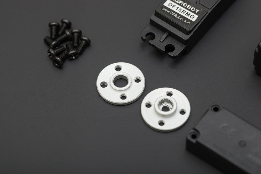 The DF15RMG standard servo equips two pairs of the servo shells. One is a stardard shell with four M4 mounting holes. And the other one includes a shell with double bearing which is specially designed for the application of the robot arm or the joints. The shells of this kit are thickened to make it stable enough for motion system.