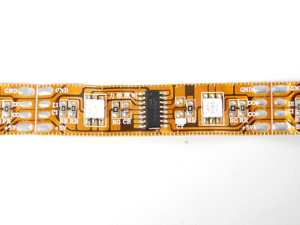 These LED strips are fun and glowy. There are 32 RGB LEDs per meter, and you can control each LED individually! Yes, that's right, this is the digitally-addressable type of LED strip. You can set the color of each LED's red, green and blue component with 7-bit PWM precision (so 21-bit color per pixel). The LEDs are controlled by shift-registers that are chained up down the strip so you can shorten or lengthen the strip. Only 2 digital output pins are required to send data down. The PWM is built into each chip so once you set the color you can stop talking to the strip and it will continue to PWM all the LEDs for you.