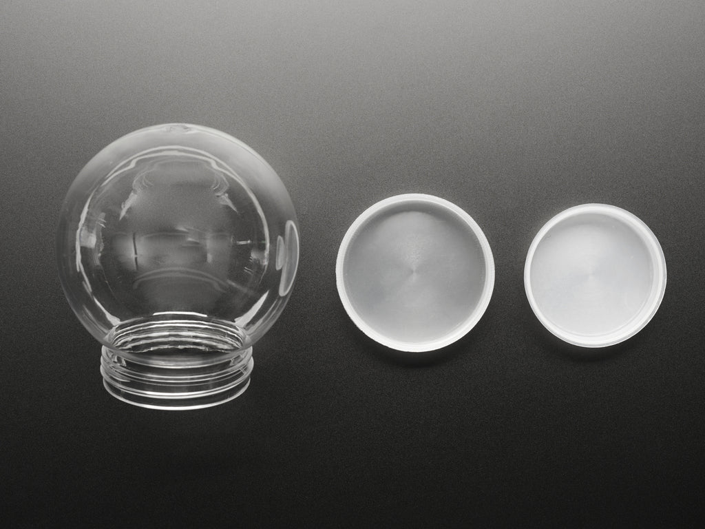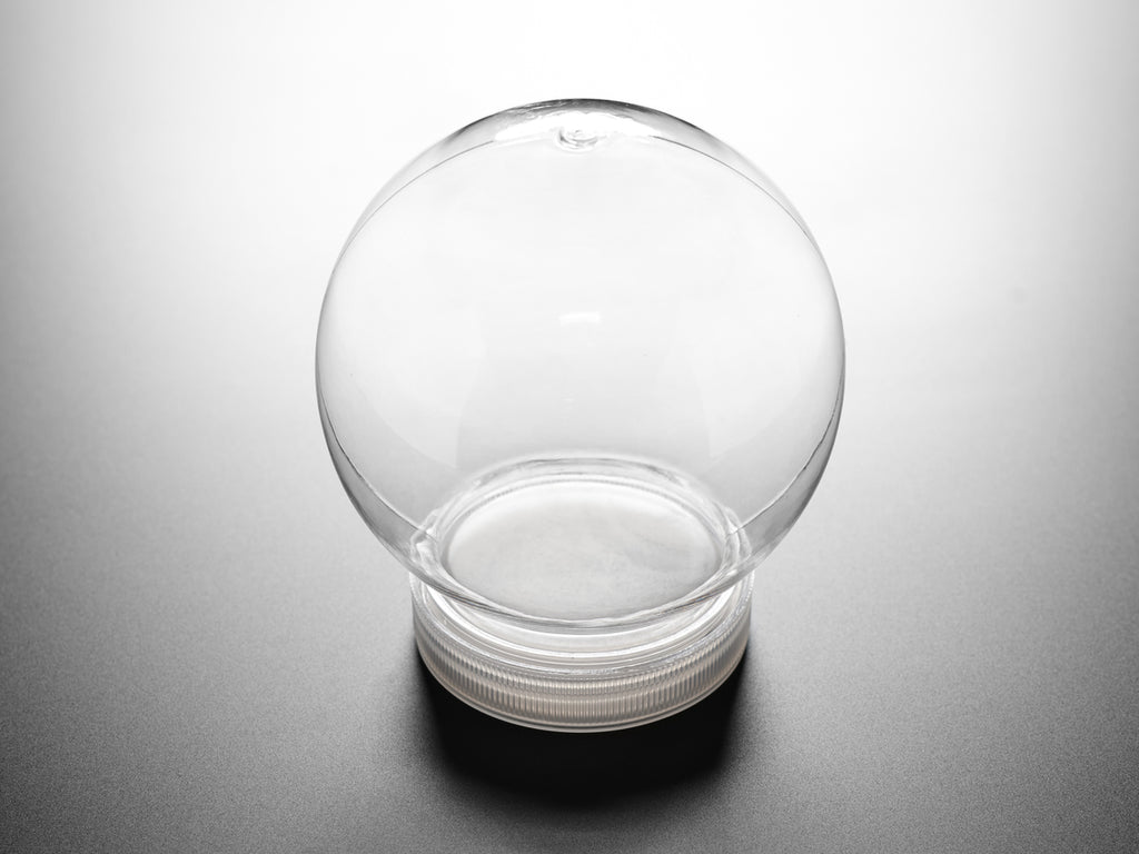 Not merely a snow globe, but a show globe! This custom container is durable, clear and round, with a large flat screw-on top and a press-fit rubber stopper. The stopper makes a nice seal, and is also hollow which means you can put (you guessed it...) electronics inside! This makes it perfect for your own electronic-powered snow globe.