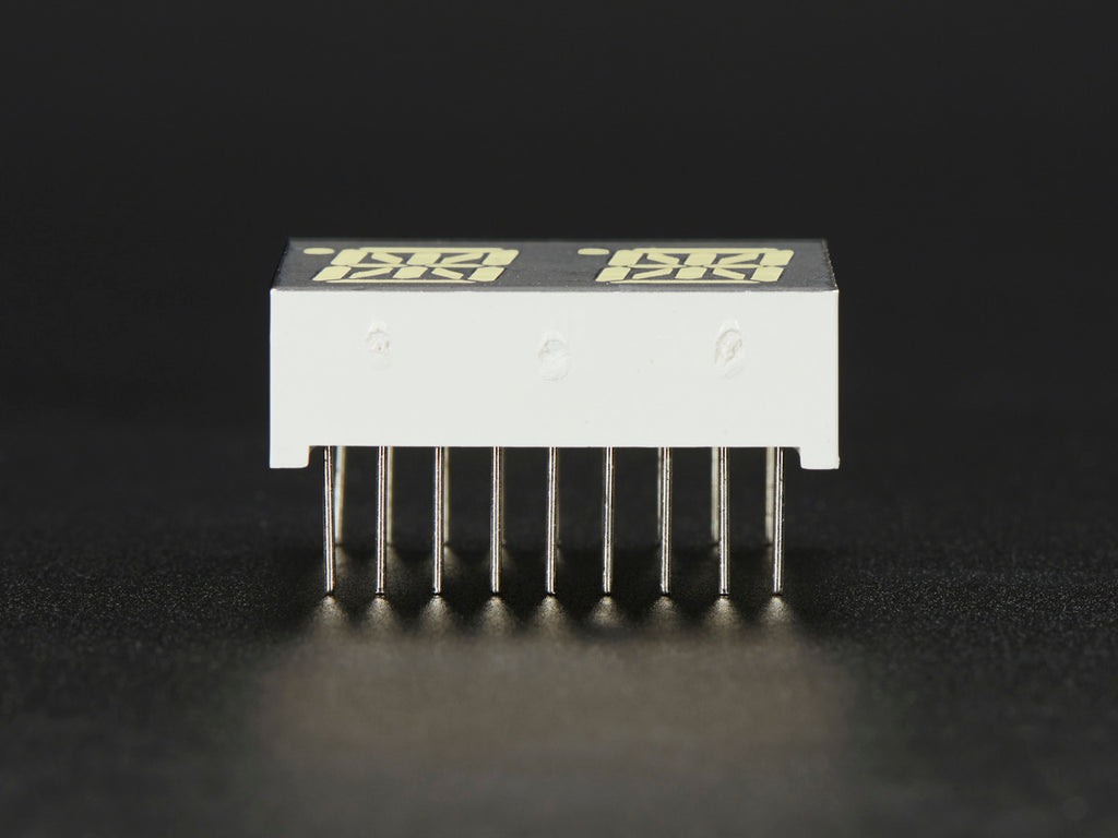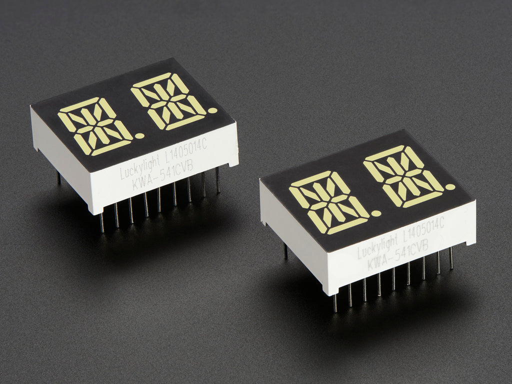 Display, elegantly, 012345678 or 9! Gaze, hypnotized, at ABCDEFGHIJKLM - well it can display the whole alphabet. You get the point. This is a nice, bright 14-segment alphanumeric display that can show letters and numbers in a beautiful white hue. It's super bright and designed for viewing from distances up to 23 feet (7 meters) away. Digits have seven yellow segments on a black surface and we give you a set of two alphanumeric displays in a pack so you can make a clock or a four letter word.