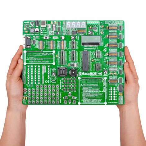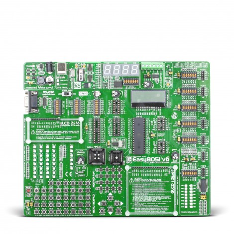 The graphic LCD 128x64 and LCD 2x16 (LCD2x16 is included) can be easily connected via the on-board connectors. The board features four 7-segment displays in multiplex mode.
