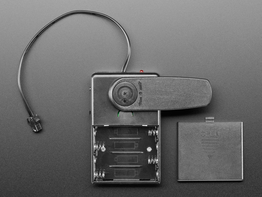 A small, portable inverter for EL wire. Powers off of 4 AAA batteries (not included!), it can drive 3-4 meters (10 to 13 feet) of our high-brightness EL wire OR 1 meter (3 feet) of EL tape OR a 10cmx10cm piece of EL panel for about 7 hours.