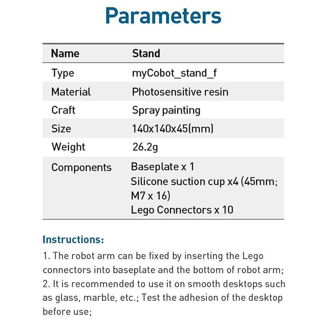myCobot-Flat Base is the base for collaborative robots from Elephant Robotics. (Fit for ER myCobot 280 M5, ER myCobot 280 Pi )Flat Base myCobot can be fixed by inserting the Lego connectors into the baseplate and the bottom of the robot arm. Let you focus more on operating the robotic arm for creation and research. It is recommended to use it on smooth desktops such as glass, marble, etc. Test the adhesion of the desktop before use.