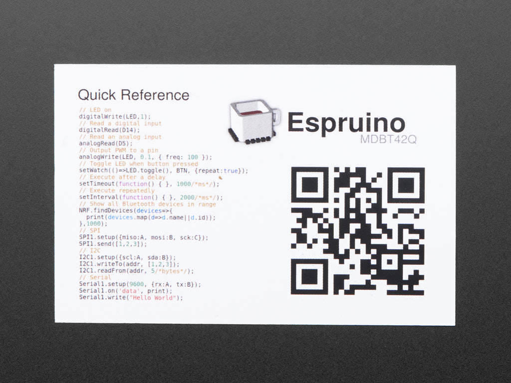 Each order comes with the Open Source JavaScript interpreter Espruino pre-installed, which makes it incredibly easy to use and means you can get started in just seconds, without any prior programming experience. You can start programming straight out of the box using WebBluetooth for an IDE!
