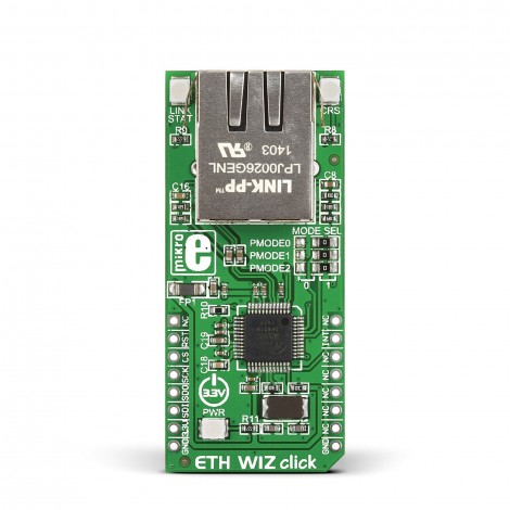 ETH WIZ Click is based on the W5500, a fully-featured high-performance 10/100 Ethernet controller from WIZnet designed for embedded applications where performance and flexibility are required. The W5500 module employs a variety of solutions to reduce the target MCU’s memory load and enable a stable and secure Internet connection. High-speed network communications are realized through a serial interface in variable-length data mode configuration. The module has 32KB of internal memory for TX/RX buffers, where each block is register-configurable. Reduced power consumption is achieved with Wake on LAN and power-down modes. Automatic handshaking, retransmitting on collision, and automatic rejection of erroneous packets are also supported. The W5500 also supports HP Auto-MDIX, allowing direct connections or cross-over LAN cables on the onboard RJ-45 connector.