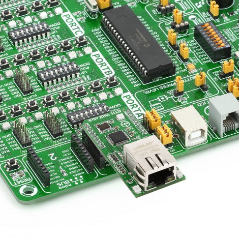 Type Ethernet Applications Can be used for industrial automation systems, IP set-top boxes, VoIP/Video phone systems, security systems, home network and gateways, test and measurement equipment, and more On-board modules W5500 - fully-featured high-performance 10/100 Ethernet controller from WIZnet Key Features Hardwired TCP/IP protocols, power-down mode, wake-on-LAN over UDP, high speed SPI interface, auto-negotiation feature, network LED indicators, reduced power consumption, and more Interface GPIO,SPI Compatibility mikroBUS Click board size L (57.15 x 25.4 mm) Input Voltage 3.3V