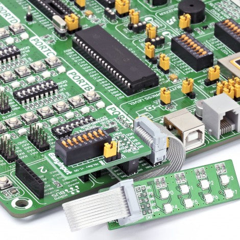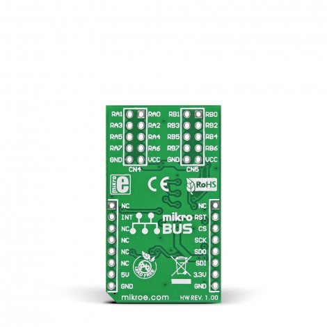 Expand click is an accessory board in mikroBUS form factor. It includes a 16-bit I/O expander MCP23S17 with SPI clock speeds up to 10 MHz for higher throughput applications. Three HARDWARE ADDRESS SEL jumpers allow you to configure board address and connect up to eight devices on the bus. Controller also supports interrupt-on-change feature. Board is set to use 3.3V power supply by default. Solder PWR SEL SMD jumper to 5V position if used with 5V systems.
