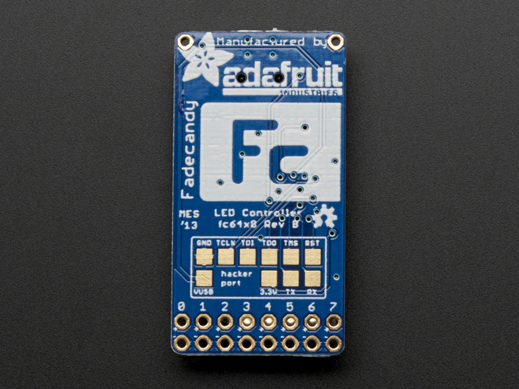 - LEDs! Fadecandy works with Adafruit's popular WS2811/WS2812 LEDs. Each controller board supports up to 512 LEDs, arranged as 8 strips of 64 each.