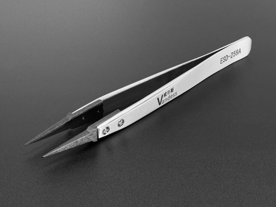 When working with surface-mount (SMD/SMT) components, a reliable pair of tweezers is essential. This model features anti-static and anti-magnetic properties, as well as a durable stainless steel body and ESD plastic tips. The pointed, fine tips make it easy to handle delicate components without causing damage. However, it is not recommended for use during hot air rework or soldering iron procedures.