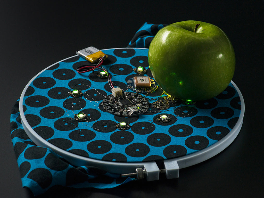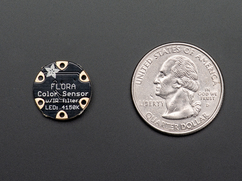 Connect to a Flora via I2C and our example code will quickly get you going with 4 channel readings. A detailed tutorial is in the works, till then, check out our Arduino library and follow our tutorial to install. Sew up the sensor by connecting 3V to 3V Flora output, Ground to common ground, SCL to I2C Clock and SDA to I2C Data on your Flora. All the pins line up and you can chain another sensor such as a lux sensor or accelerometer. Restart the IDE and select the example Flora sketch and start putting all your favorite fruit next to the sensor element!