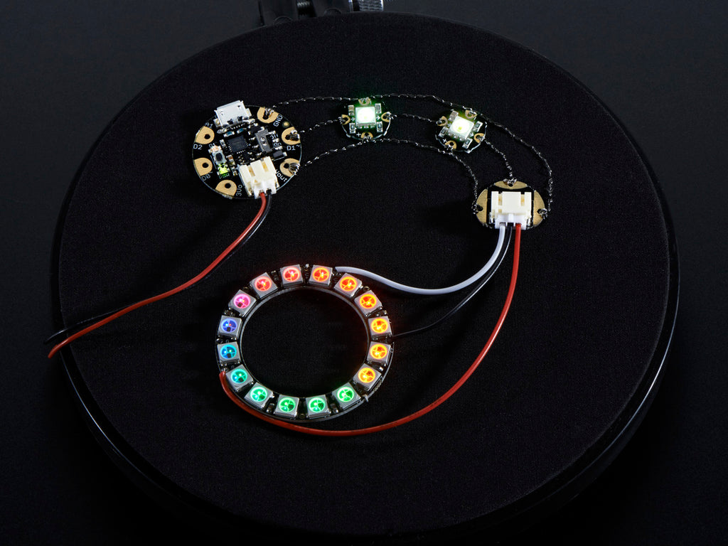 We also include a 3-pin JST-PH cable. This product only includes the assembled sew-tap board with the 3-wire JST cable assembly. Does not include Flora NeoPixels or Flora!