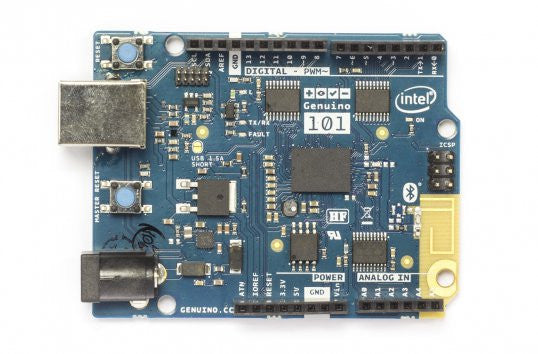 Genuino 101 is a learning and development board that delivers the performance and low-power consumption of the Intel® Curie™ Module with the simplicity of Genuino at an entry-level price. It keeps the same robust form factor and peripheral list of the UNO with the addition of onboard Bluetooth LE capabilities and a 6-axis accelerometer/gyro to help you easily expand your creativity into the connected world. The module contains two tiny cores, an x86 (Quark) and an ARC, both clocked at 32MHz. The Quark core runs ViperOS RTOS and helps the Arduino core to accomplish the most demanding tasks. It comes with 14 digital input/output pins (of which 4 can be used as PWM outputs), 6 analog inputs, a USB connector for serial communication and sketch upload, a power jack, an ICSP header with SPI signals and I2C dedicated pins. The board operating voltage and I/O is 3.3V but all pins are protected against 5V overvoltage.