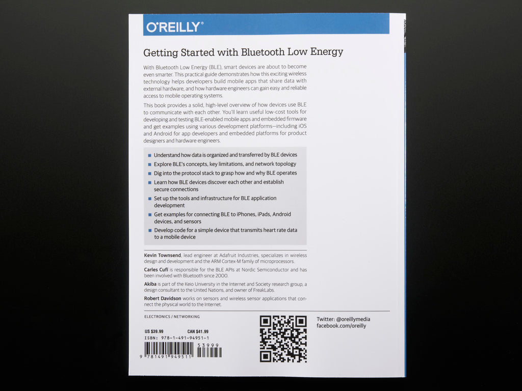 You're interested in what all this BLE stuff is about, anyways? Let Adafruit's lead Engineer, Kevin "KTOWN" Townsend (a.k.a "50 Ohm") guide you in this detailed tome. KTOWN teamed up with Akiba (a.k.a "Wireless EL blinky guy") to throw down all their knowledge in this book. Getting Started with Bluetooth Low Energy: Tools and Techniques for Low-Power Networking by Kevin Townsend, Carles Cufí, Akiba & Robert Davidson is the only BLE book you'll ever need at your side