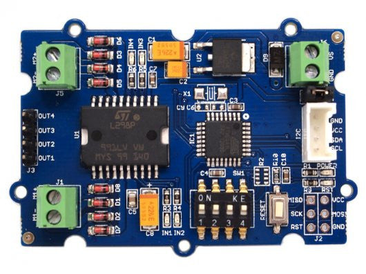 The easy software interface is not the only easy-to-use feature because the I2C motor driver is designed to get you up and running in notime. It features a LED for power and four LED's to indicate if and to which direction each motor is running. Screw terminals facilitate motor and power connections, and the GROVE system plug and I2C interface enables you to daisy-chain the driver with many other devices.