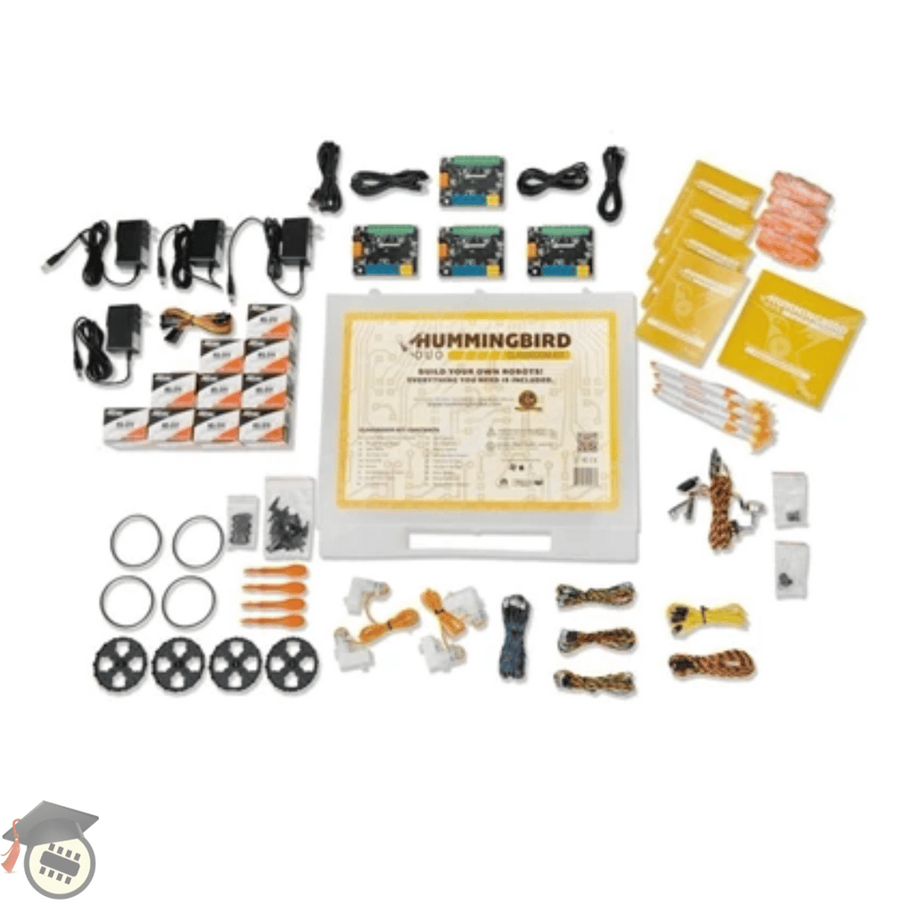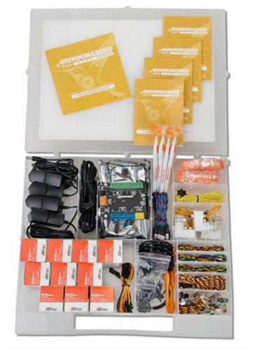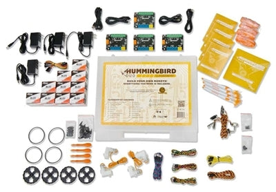 The Hummingbird Duo classroom kit is designed for the classroom. Parts are housed in a durable plastic organizer tray, and in addition to Hummingbird components the kit also includes a printed teacher guide, four USB flash bands, four Hummingbird pens. One classroom kit is sufficient for a small class or group of 8-12 students; a regular classroom will probably require two kits.