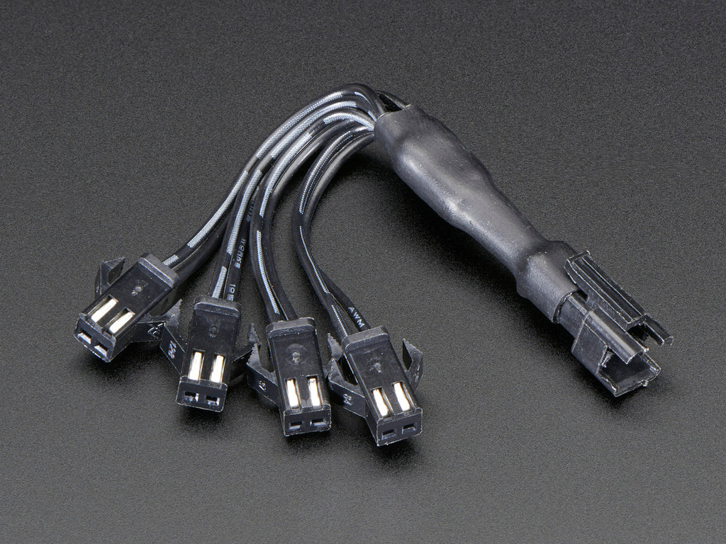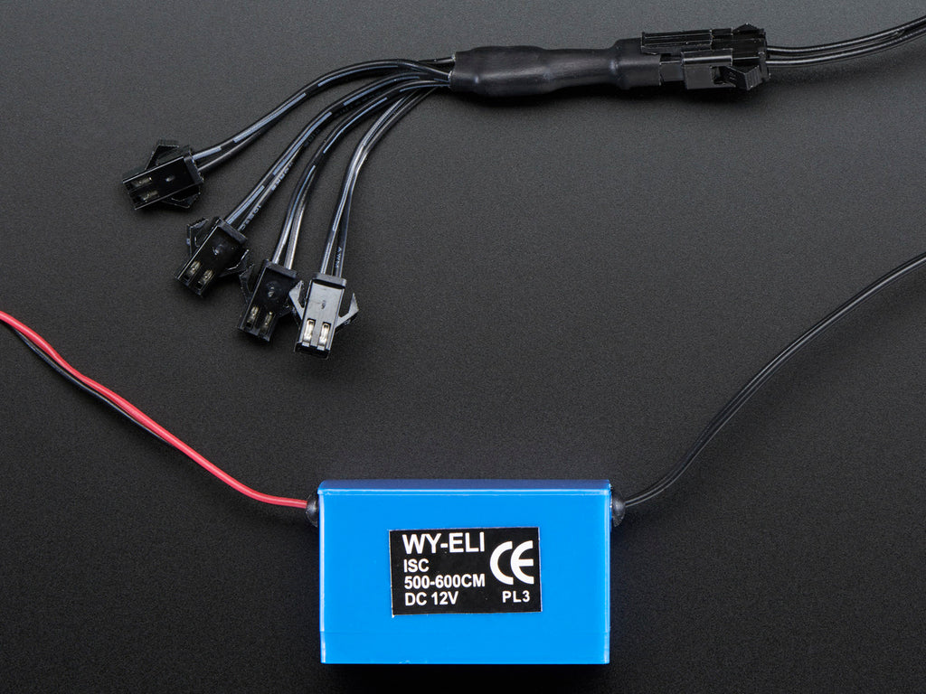 If you want to connect multiple EL wires/strips/panels up to one inverter, these splitters are quite useful. There is one male connector (goes to the inverter) and then 4 female connectors (which will connect to each wire/strip/panel. You can even cascade them! Only thing to watch for is make sure that the total length of EL does not exceed what the inverter can drive!