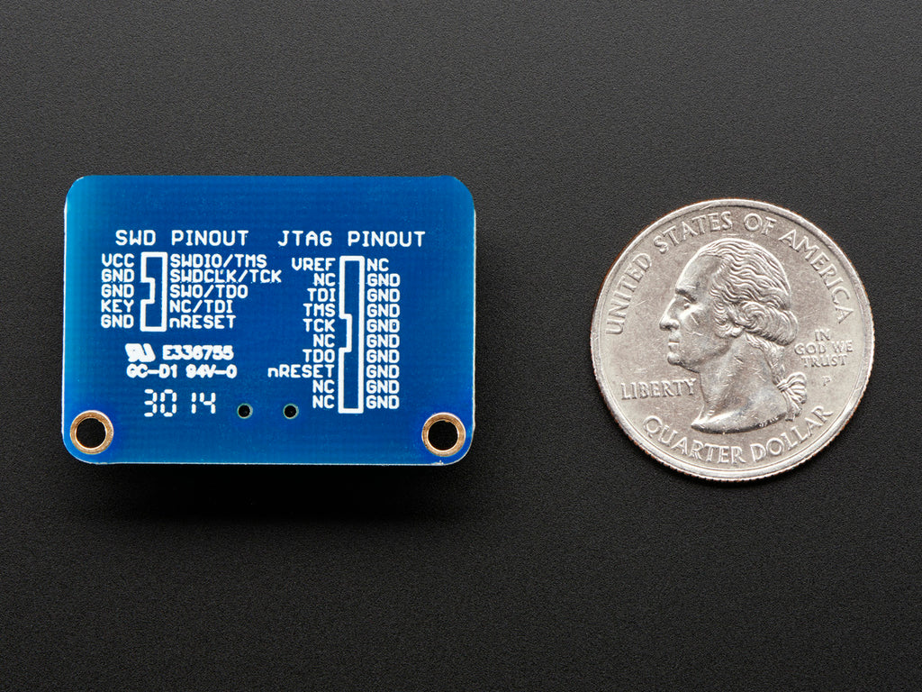 This adapter board is designed for adapting a 'classic' 2x10 (0.1"/2.54mm pitch) JTAG cable to a slimmer 2x5 (0.05"/1.27mm pitch) SWD Cable. It's helpful for using products like the JTAGulator or SEGGER J-Link with tiny boards that use the 10-pin SWD programming connector.