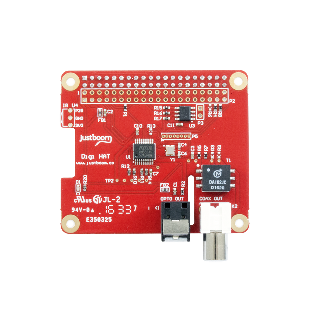 The JustBoom Digi HAT is a high resolution digital audio output add on board for the Raspberry Pi. Simply stack the plug-and-play add on board (HAT) onto your Raspberry Pi A+, B+, 2B or the new 3B and it will be ready to use immediately. The JustBoom Digi HAT produces an unmodified, high quality, digital audio data stream for bit-perfect transmission to your hifi system.