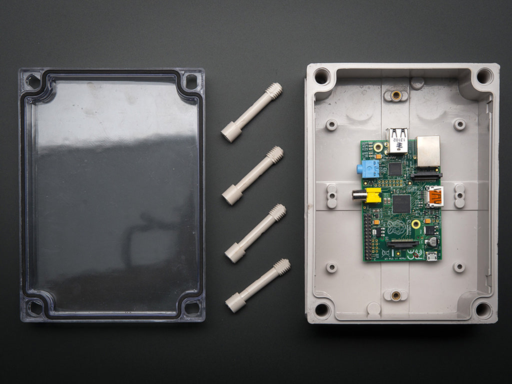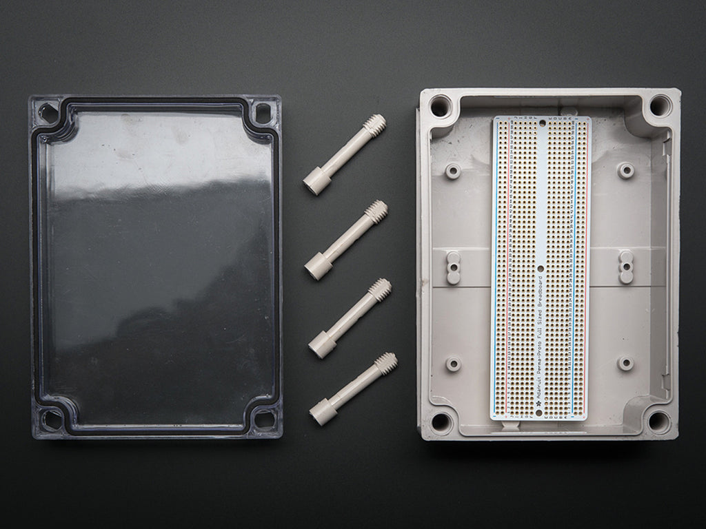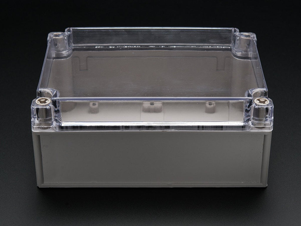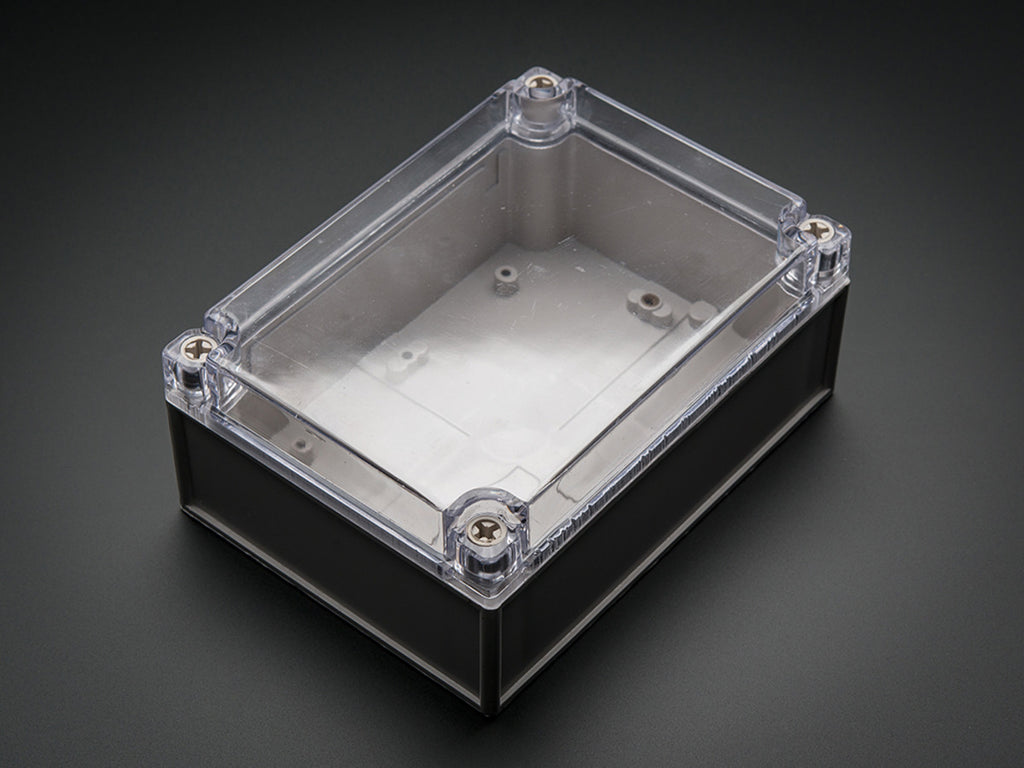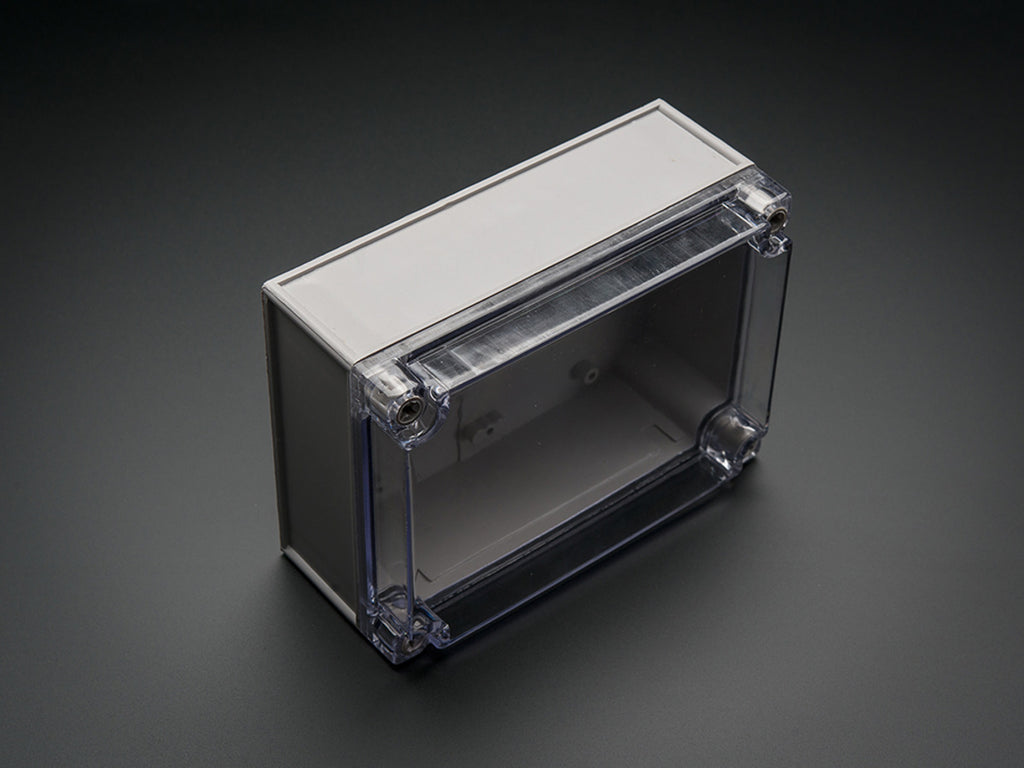Store your project safe and sound in this nice weatherproof box with a clear top. We picked up this box because we like the machinable ABS plastic body and tough clear polycarbonate cover, the built in weatherproof gasket seal, and the easy-open screws that can be taken apart as many times as you wish without worrying about cracking or stripping.