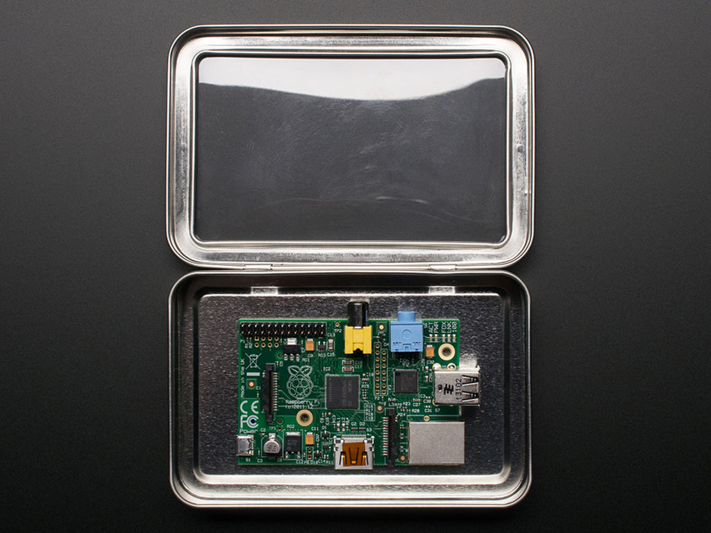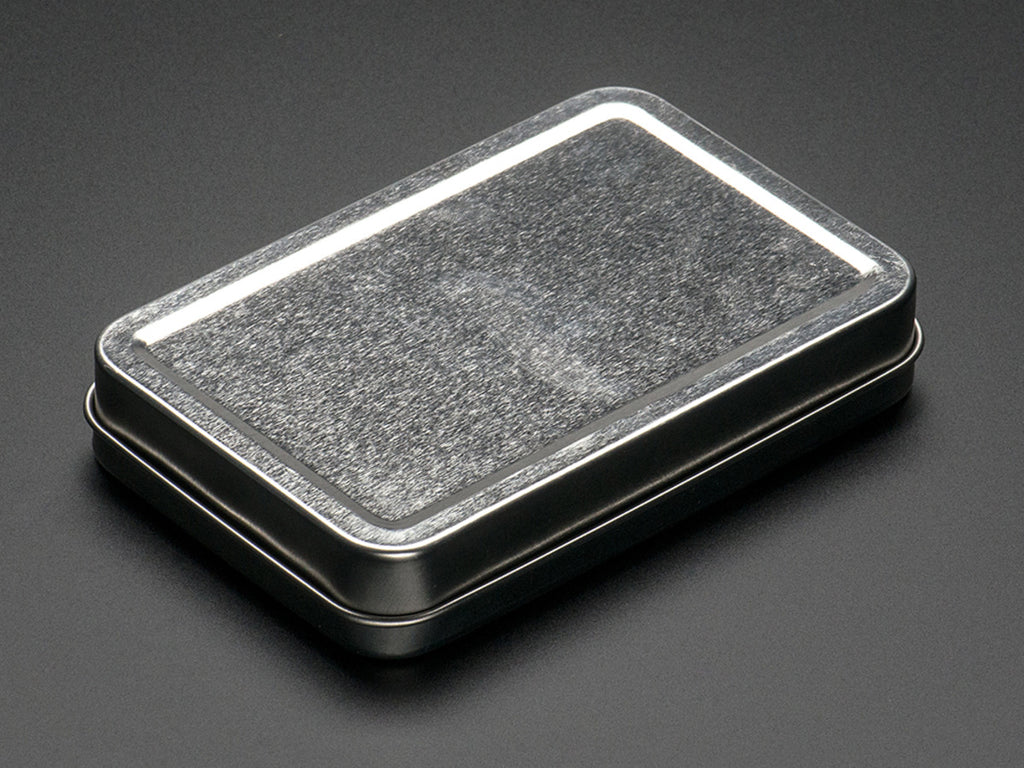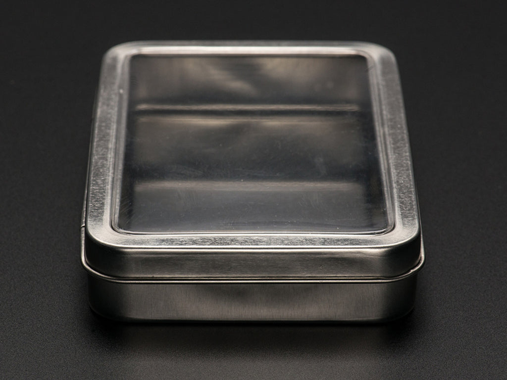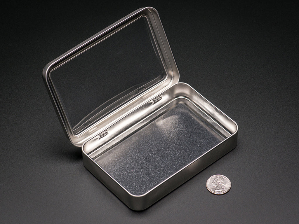 Big project! Big tin! You've got too much stuff to fit into a 'classic' Altoids-size tin, so you need an upgrade and here it is! This tin is about 3.5" by 5.5" so it's got plenty of space for an Arduino Uno or Mega, or Raspberry Pi, or Beagle Bone, or really any dev board you could think of. The tin is sturdy but easy to punch holes in or cut with tin snips. The clear top is handy to keep an eye on indicators or TFTs. The top is made of a thick plastic film, so you can remove it with a hobby blade.