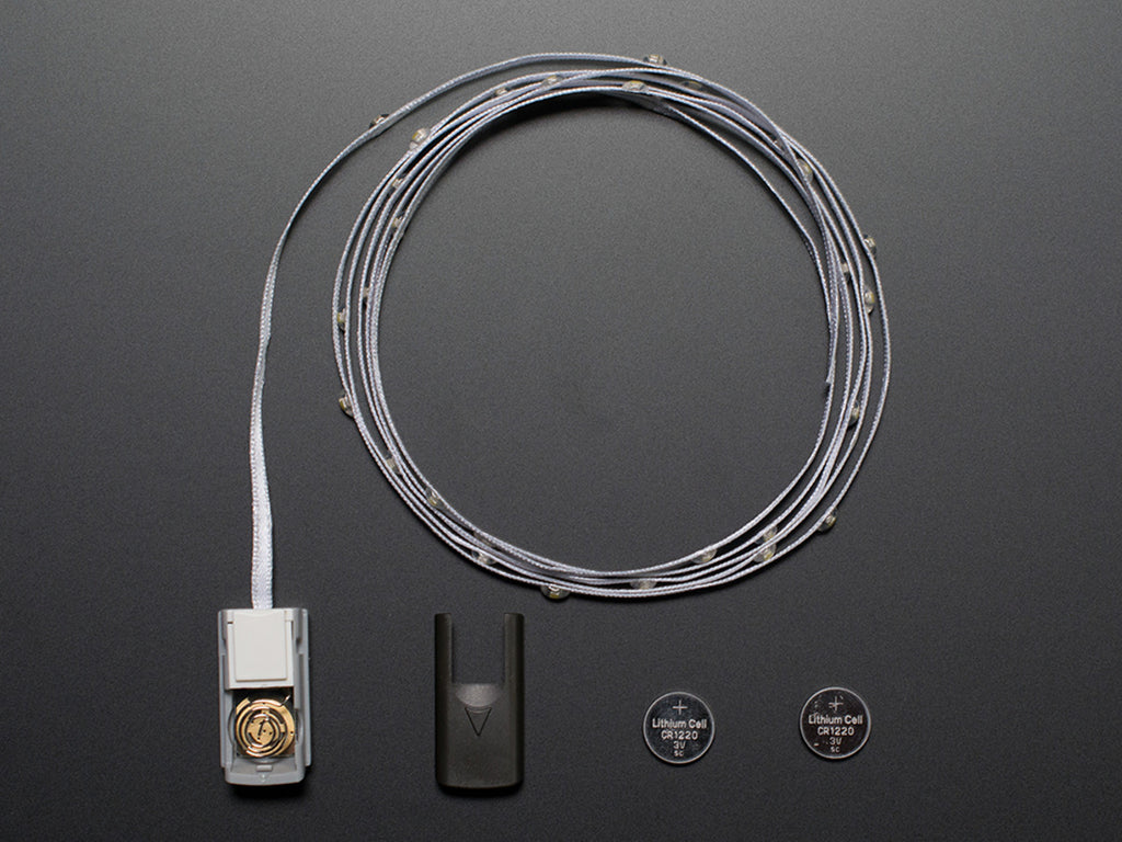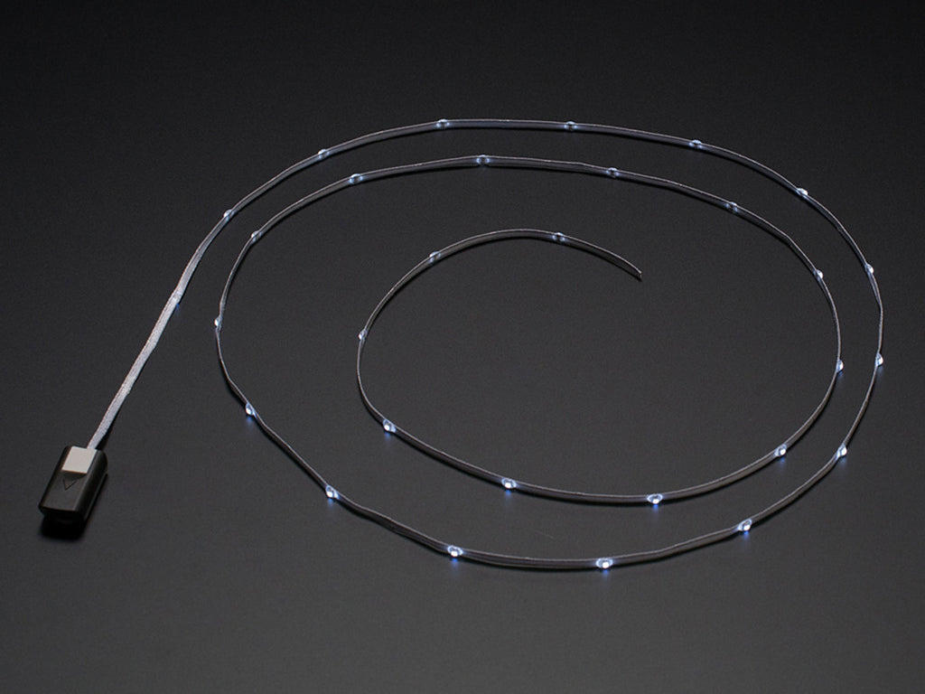 This soft fabric ribbon has tiny surface mount LEDs bonded onto two thin conductive threads that go along the length. A tiny battery pack controller snaps onto the end. The result is an ultra-flexible and elegant-looking way to add LEDs to a wearable project.