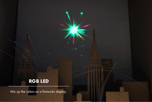 The RGB LED (or Red-Green-Blue Light-Emitting Diode) Bit is a light with adjustable colour. You can use the purple littleBits screwdriver to turn the dials and create your own custom colour mix of red green and blue.