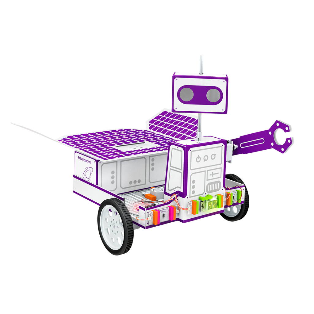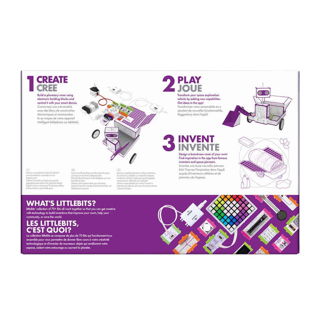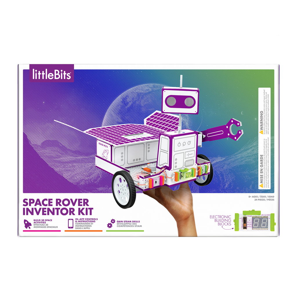 Creative kids build and customize a planetary rover using littleBits electronic building blocks then transform it by adding out-of-this-world capabilities! Over 30 activities in the free Inventor App guide kids through building and controlling space vehicle inventions like a space rock collector or an alien life detector learning STEAM (Science Technology Engineering Art Mathematics) skills and drawing inspiration from real space pioneers. Through both hands-on and digital play kids gain lifelong skills to become changemakers through invention. Product features include in-app instructions for 30 space activities tech sensors paper templates wheels mounting boards LED light motors battery stickers and free Inventor App and battery.