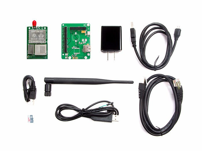 There are several type of RHF0M301 distinguished by different communication frequency. This kit provides RHF0M301-915MHz (for 868MHz version, please click here), so we also included a 915MHz antenna. Apart from that the kit also contains an 8GB SD card and USB cables, Ethernet Cables and other accessories.