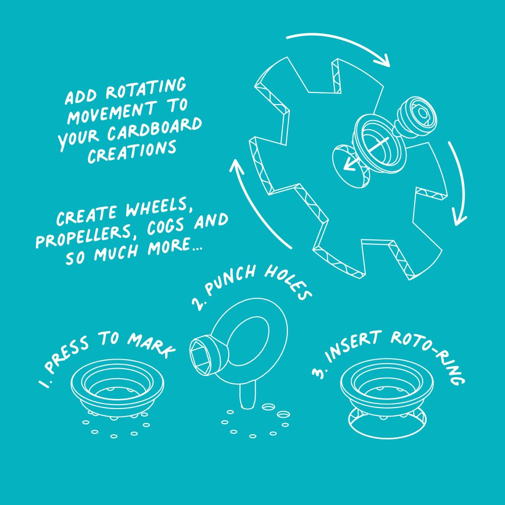 By facilitating turning, rotating and sliding motions, the Roto-Ring — made from 100% recycled materials — will bring a whole world of new possibilities to your Makedo designs.