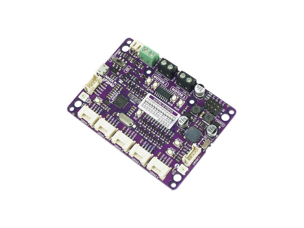 The Maker Pi RP2040 features the first microcontroller designed by Raspberry Pi - the RP2040 - embedded on a robot controller board! The board comes with a 2-channel DC motor driver, 4 servo motor ports, 7 Grove I/O connectors, and lots of LEDs for troubleshooting and visual effects.