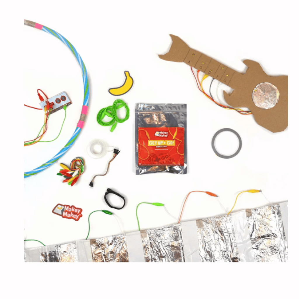 The Get Up + Go! Booster Kit is designed to get you up and moving around and using your Makey Makey in new ways. The materials included in this booster kit along with the inspiring project guides should get you thinking about incorporating Makey Makey into oversized inventions and physical activities for the perfect combination of movement, science, and technology.