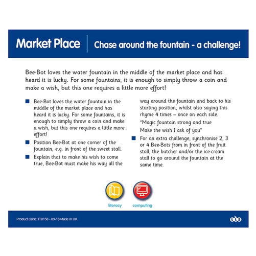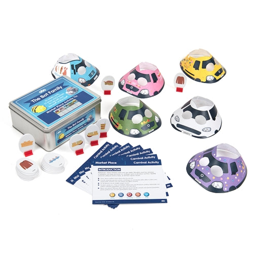 Included in the tin are 6 character jackets to transform Bee-Bot into a range of Marketplace characters, 10 cards with cross-curricular activity ideas and 20 prop pieces to place on the mat.